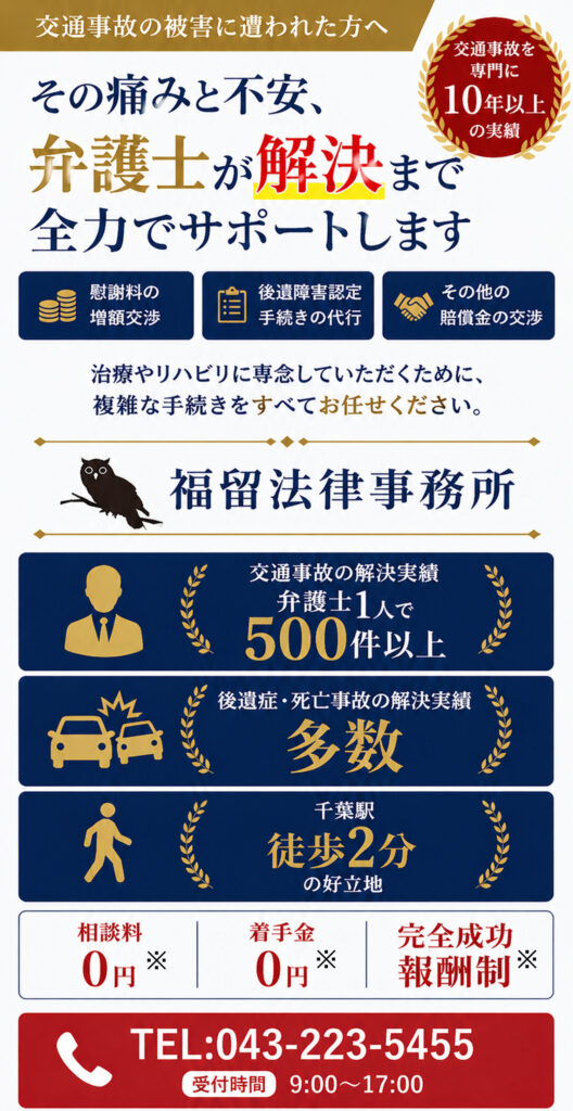 当事務所では、交渉や裁判によって得られる賠償金の見込額を無料で査定しておりますので、お気軽にお問い合わせください。