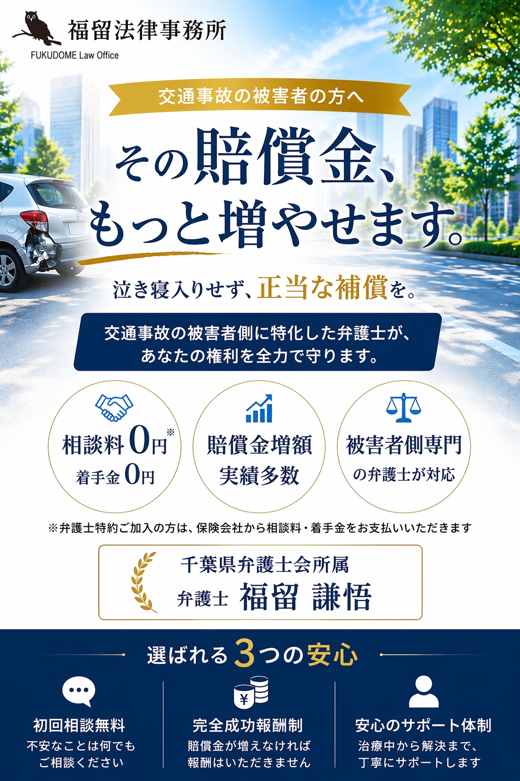 法律相談料は無料です。(弁護士費用特約にご加入の場合,保険会社からお支払いいただきます)